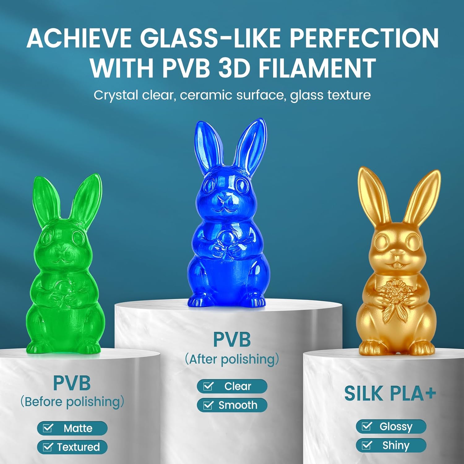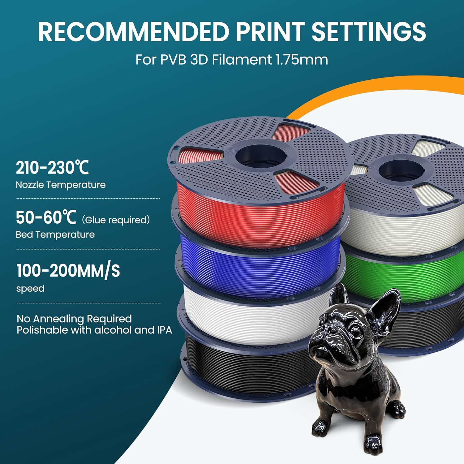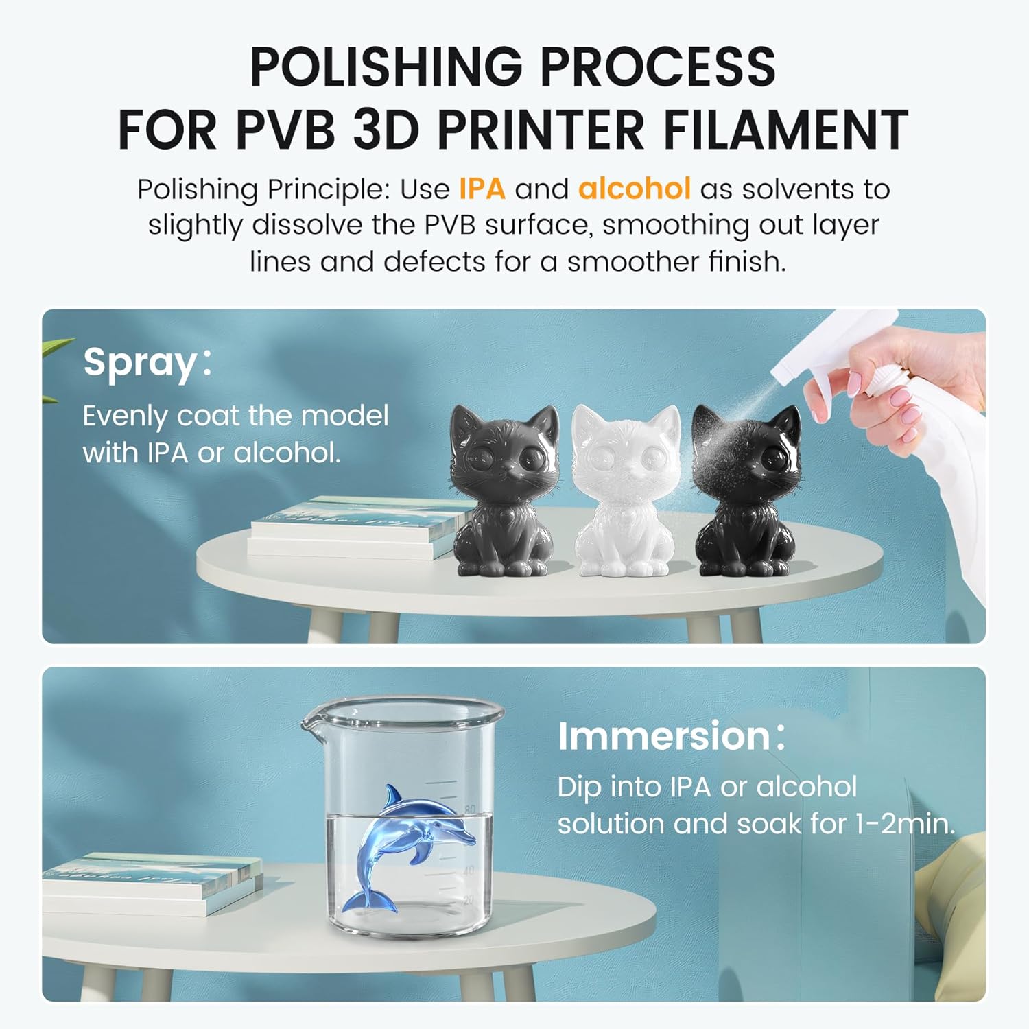 SUNLU PVB-filament (Polyvinyl Butyral) giver dig mulighed for at skabe glatte, skinnende overflader med minimal indsats. Efter udskrift kan modellen nemt behandles med isopropylalkohol (IPA 99%) – spray, tør eller dyb i alkohol – hvilket let opløser det yderste lag og efterlader en glat, næsten glaslignende finish. Sig farvel til synlige laglinjer!
