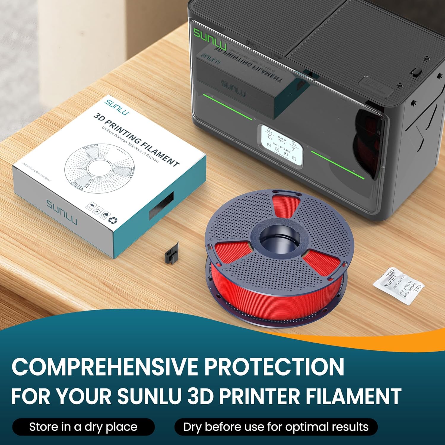Filamentet er omhyggeligt viklet for at undgå sammenfiltring, tørret og vakuumpakket i en genlukkelig pose med tørremiddel. Da PVB nemt absorberer fugt, anbefales det at bruge en filamenttørrer (fx SUNLU S1PLUS, S2 eller S4) for optimal udskriftskvalitet.