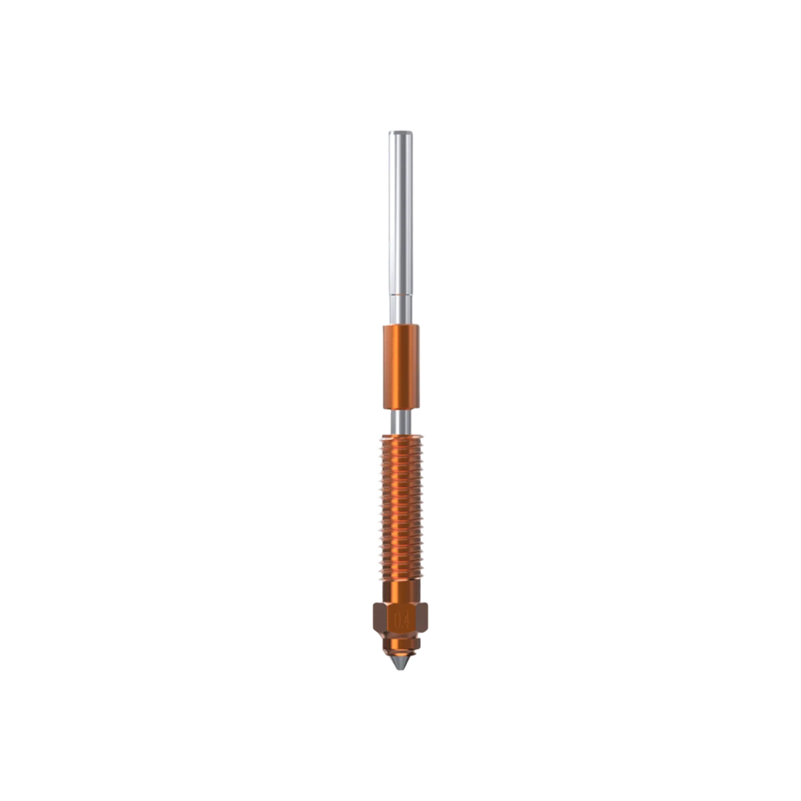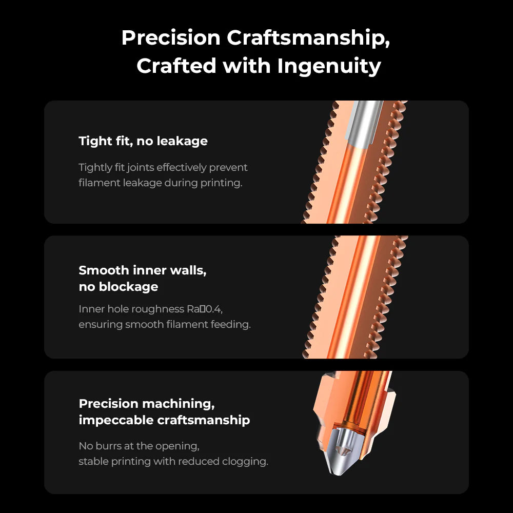 Heat break er fremstillet af titaniumlegering, hvilket reducerer varmeledning. Dysen er lavet af kobberlegering og hærdet stål, hvilket understøtter print med forskellige filamenttyper.