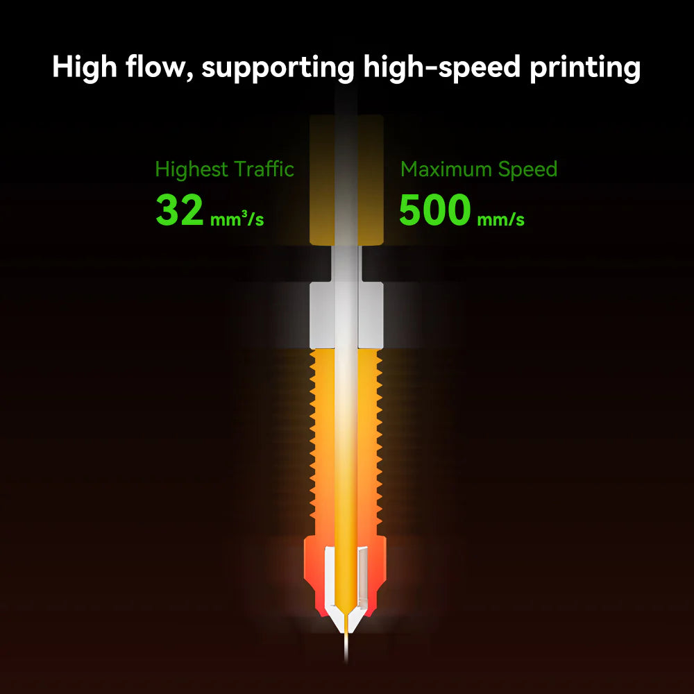 Det udvidede dysekammer opnår en maksimal flowhastighed på op til 32 mm³/s og understøtter højhastighedsprint ved 500 mm/s * 0,4 mm dyseåbning (testdata ved 240 °C printktemperatur).