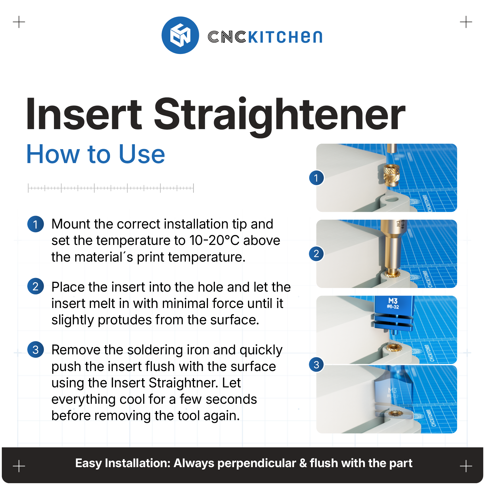 Få perfekt lige og flush-monterede heat set inserts – også på svære steder. Insert Straighteneren hjælper dig med at holde indsatsen 100 % vinkelret på emnets overflade og giver et mere professionelt resultat, hver gang.