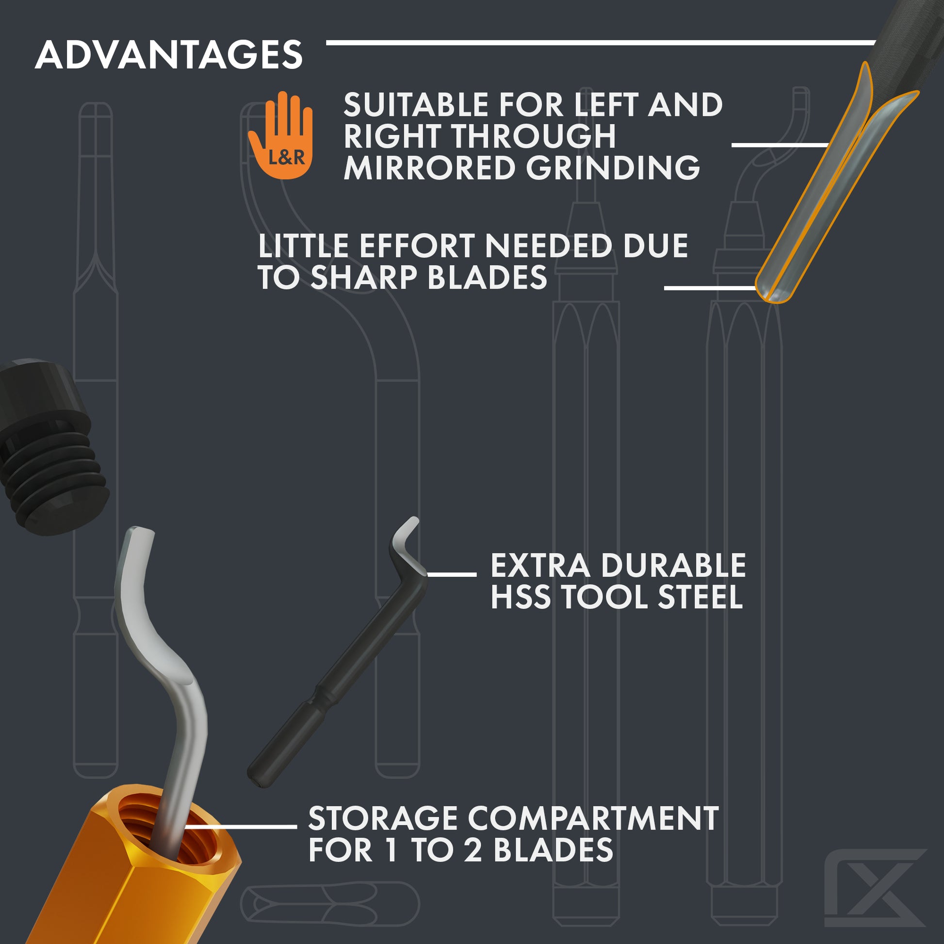 Alle klinger roterer frit 360° og kan bruges af både højre- og venstrehåndede. Hurtigudløseren sikrer hurtige og trygge klingeskift. En kompakt opbevaringsboks medfølger.