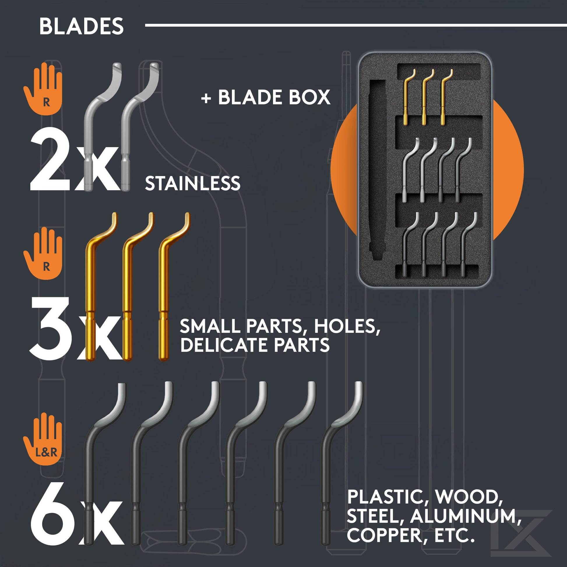 - Inkluderer 11 slidstærke HSS-klinger med 360° rotation