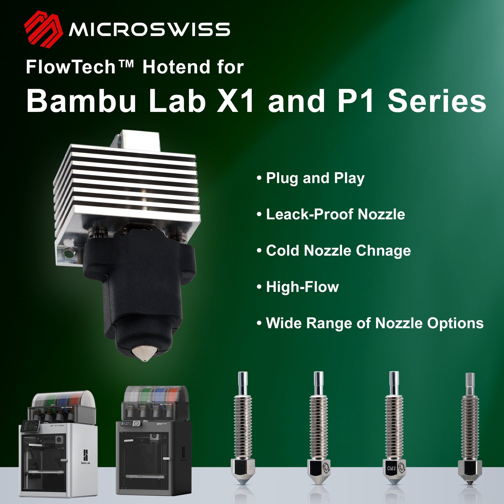 FlowTech Hotend fra Micro Swiss er en direkte drop-in-erstatning, der er designet specielt til Bambu Lab X1- og X1 Carbon (X1C)-printere. Med et robust design helt i metal, innovativ bimetallisk varmespærre og værktøjsfri dyseudskiftning giver den forbedret termisk stabilitet, højere flowhastigheder og ubesværet vedligeholdelse - uden at det kræver ændringer i firmware eller hardware.