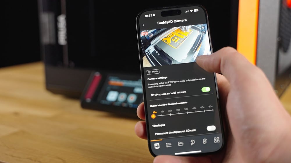Buddy3D Camera er et dedikeret overvågningskamera til Prusa-3D-printere, der kan fungere i helt mørke takket være indbygget IR-belysning og optik af høj kvalitet. Det tåler op til 65 °C, så det kan placeres direkte inde i printerens kabinet. Du kan manuelt justere kameraets vinkel med op til 180° i vandret plan og 45° opad. Tilslutning sker via Wi-Fi og opsættes hurtigt ved hjælp af Prusa Connect og scanning af en QR-kode. Kameraets firmware opdateres trådløst (OTA), og kommunikationen er sikker—kun mellem kameraet og Prusas sikre netværk.