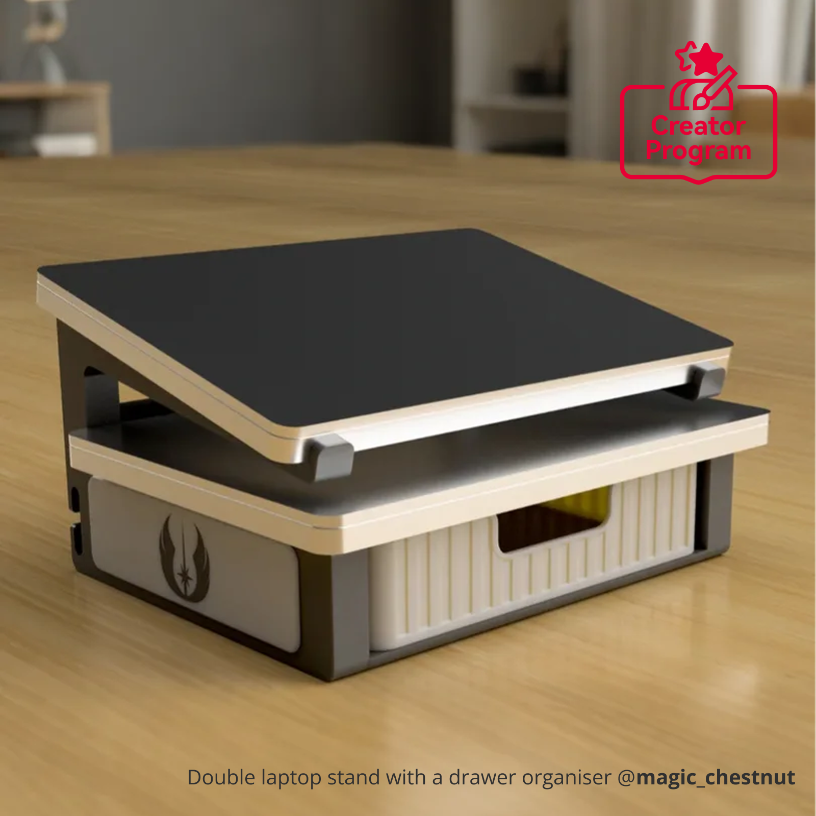 For at downloade modelfilerne, besøg venligst Double laptop stand with a drawer organiserMakerWorld.