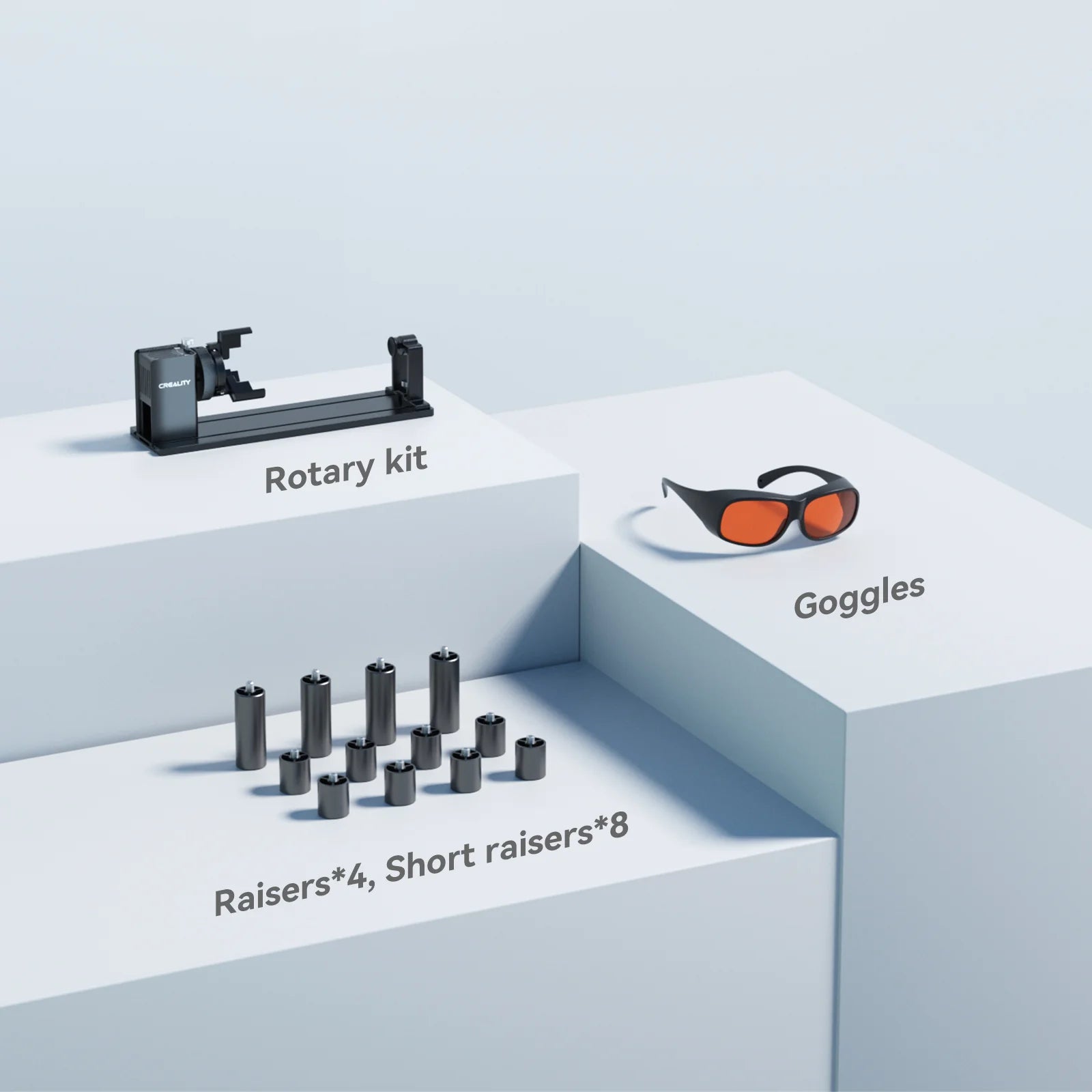 Udvid dine kreative muligheder med Creality Falcon A1 ved hjælp af Rotary Kit Pro Upgrade Package. Sættet er designet til præcision og fleksibilitet og gør det nemt at gravere cylindriske, sfæriske og ringformede objekter – perfekt til kopper, penne, smykker og meget mere.