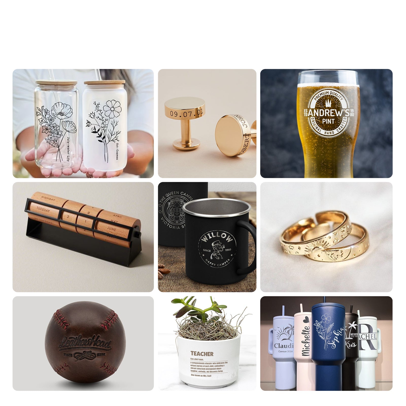 Gravér på materialer som metal, glas, træ og læder. Uanset om du laver personlige gaver, kunstværker eller tilpassede produkter, giver Rotary Kit Pro Upgrade Package dig frihed og præcision til at skabe noget unikt.