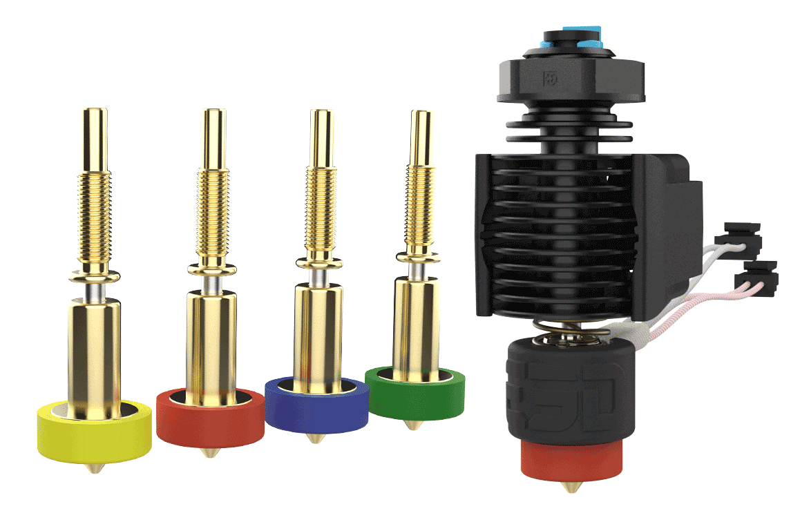 Klar til Revo. Skift dyser ved stuetemperatur med fingrene. Ingen komplicerede værktøjer og ingen varm tilspænding. Revo-dyser er fabriksforseglede enheder, hvor dyse og heatbreak er samlet i én del, så de er nemme at montere og ikke kan lække materiale under brug.