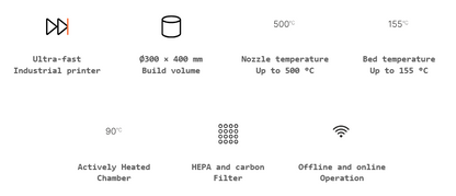 Udstyret med et udskifteligt printhoved med en højtemperatur nozzle, der kan nå 500 °C, håndterer HT90 også krævende materialer som PEEK, PEKK, PPS, PSU, PES, PEI (Ultem) til små til mellemstore genstande. Dette gør den til den mest overkommelige 3D-printer til højtydende filamenter. Den indbyggede recirkulationssløjfe renser konstant luften inde i kammeret gennem et HEPA-filter. Både High-Flow og High-Temperature printhoveder er inkluderet i pakken.