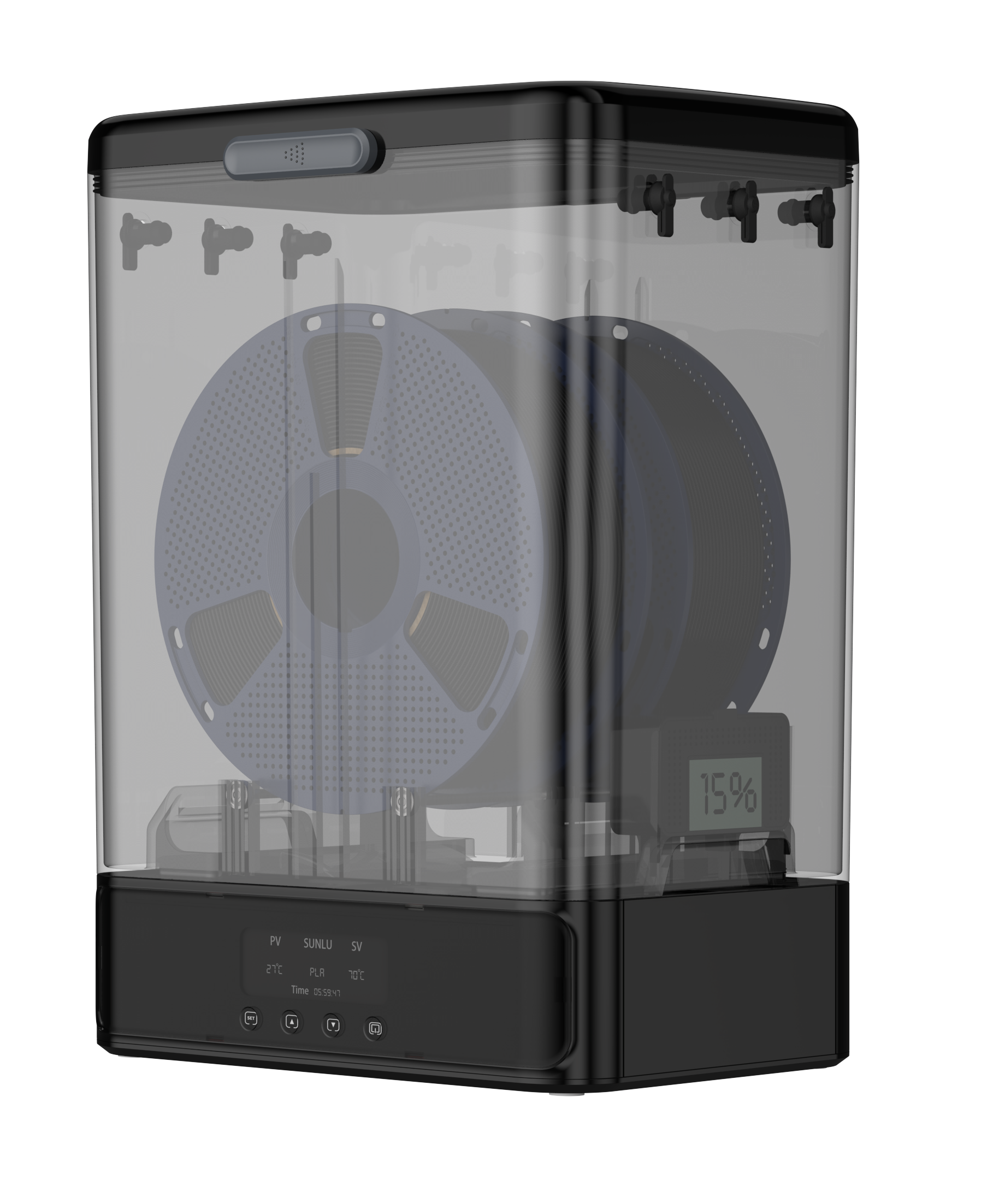 Ud over at tørre filament fungerer SP2 også som en førsteklasses opbevaringsboks. Den kan rumme forskellige spolekonfigurationer og bruges selvstændigt. Ergonomiske håndtag gør den let at transportere, og kabeludtag gør den praktisk i forskellige opsætninger.